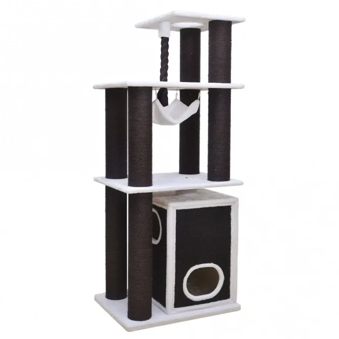 Der Kratzbaum hat alles was sich eine Katze wünscht: eine feste Oberfläche, breite Pfähle aus Sisal, eine komfortable Hütte aus 2 Etagen, eine hohe Hängematte, einen erhöhten Korb und eine dicke Spielkordel.