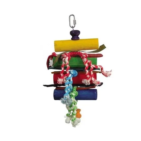 Dieses Vogelspielzeug besteht aus einem Metallstab, auf dem verschiedene Elemente aus buntem Holz, Leder und Seil aufgefädelt sind.