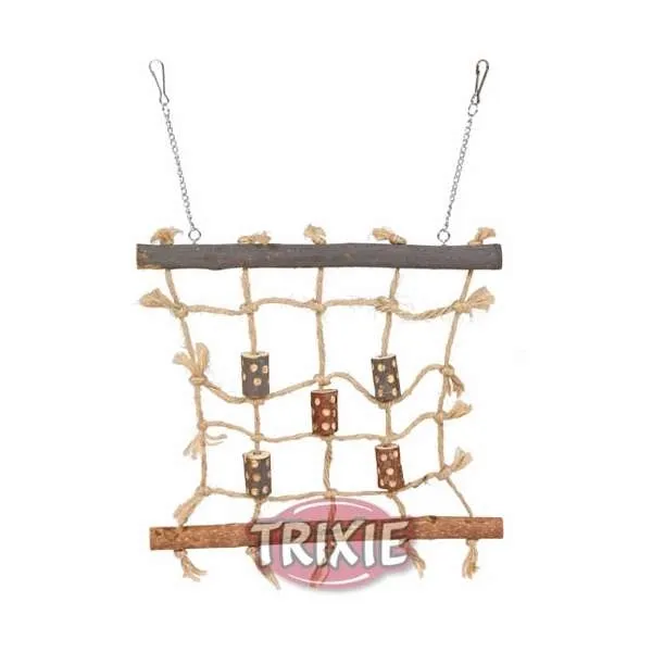 Klettergerüst aus Holz mit Sisalnetz für kleine Vogelarten, wie Wellensittiche oder Kanarienvögel. Lässt sich mithilfe von zwei Ketten mit Haken einfach am Käfiggitter befestigen.