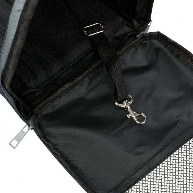 Der Rucksack, der ebenso als Tragetasche genutzt werden kann, besteht aus strapazierfähigem Nylon/Polyester und kann zum Reinigen einfach ausgewischt werden. Eine separate Fronttasche bietet Platz für Kleinigkeiten und Zubehör, eine integrierte Kurzleine verhindert das Herausspringen des Tieres während des Transportes. Der Rucksack lässt sich seitlich und von vorne öffnen und ist mit stufenlos verstellbaren Schultergurten und mehreren Netz-Einsätzen für eine gute Luftzirkulation ausgestattet. Außerdem sind auf der Rückseite Laschen vorhanden, die ein Anschnallen des Rucksacks im Auto ermöglichen. Dadurch dass die Seitenteile sich per Reißverschluss komplett öffnen lassen, kann die Tasche bei Nichtgebrauch platzsparend zusammengelegt werden.